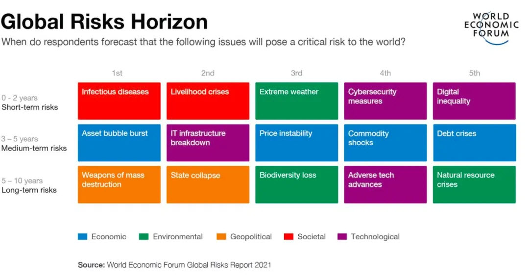 明确的现实危险(0-2年)揭示了对生命和生计的关切,其中包括传染病、就业危机、数字不平等和年轻人幻想破灭。至于中期风险(3-5年),受访者认为世界将受到经济和技术风险的连锁效应的威胁,这些风险可能要过几年才会显现,其中包括资产泡沫破裂、IT基础设施崩溃、价格动荡和债务危机。生存威胁(5-10年)是需要关注的长期问题,例如大规模杀伤性武器、国家崩溃、生物多样性丧失和不利的技术进步。