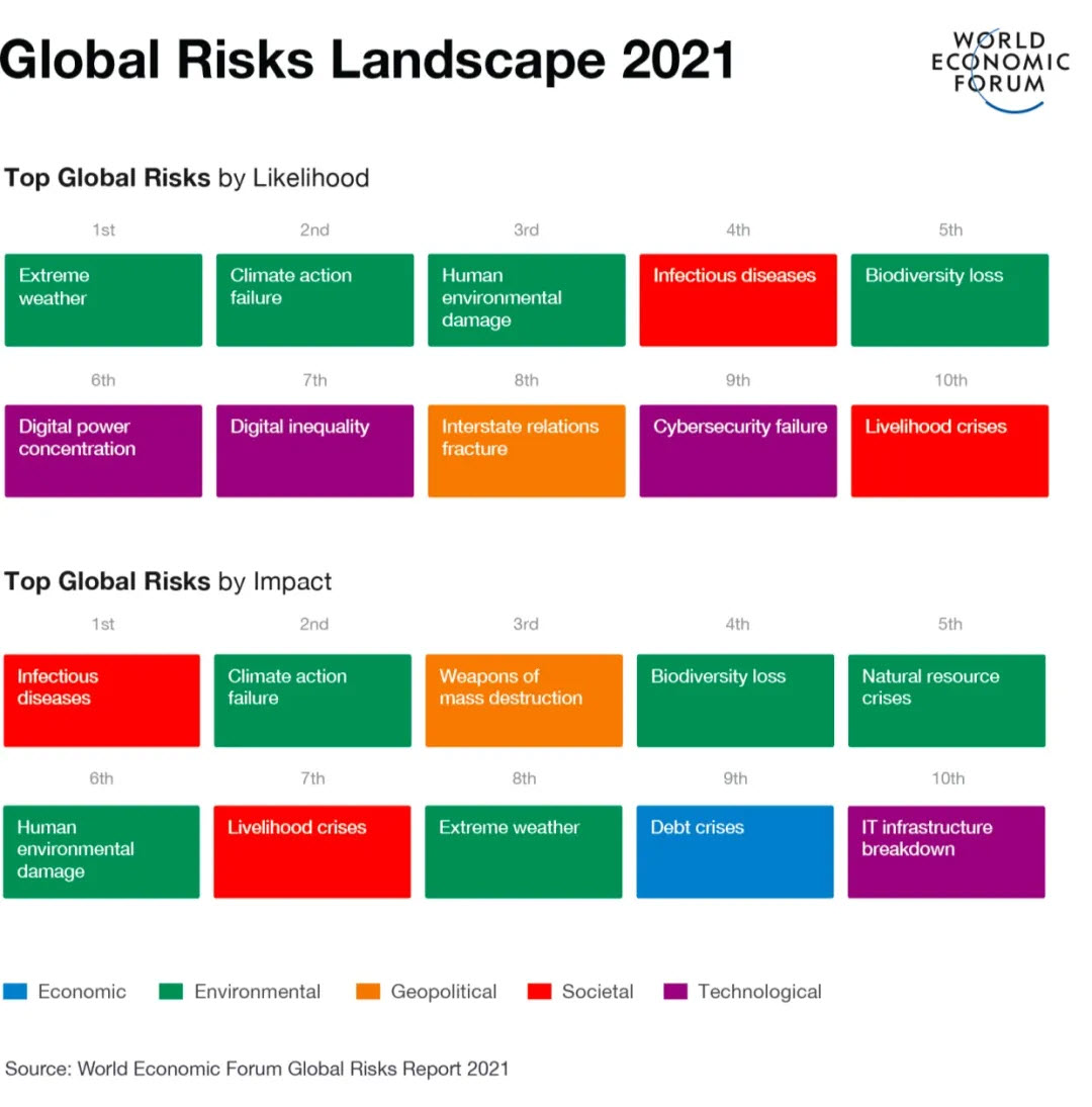 ❒  在过去15年里,世界经济论坛发布的《全球风险报告》一直在警告世界关注大流行病的危险。2020年,我们看到了忽视长期风险及其应对举措的严重影响。新冠肺炎大流行不仅夺去了数百万人的生命,还拉大了长期存在的健康、经济和数字差距。数十亿护理工作者、工人和学生——特别是在疫情爆发前便处于弱势地位的少数族裔——可能错失疫后复苏带来的新机遇,未能迎接一个更公平的新社会。根据今日发布的《2021年全球风险报告》,这些事态可能会进一步阻碍解决环境退化等长期挑战所需的全球合作。